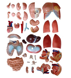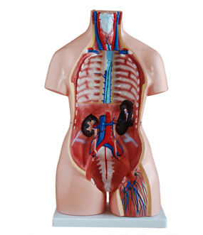 这款两性躯干模型分成40件:躯干,女性胸腔盖,头,眼球,脑(8件),脊椎神经(4件),肺(4件),心(2件),气管,食管和主动脉,横膈膜,肝,肾,胃(2件),肠(4件),男性生殖器官(4件)和女性生殖器官带胎儿(3件)。用PVC制成,安放于塑料座上。尺寸:85cm。